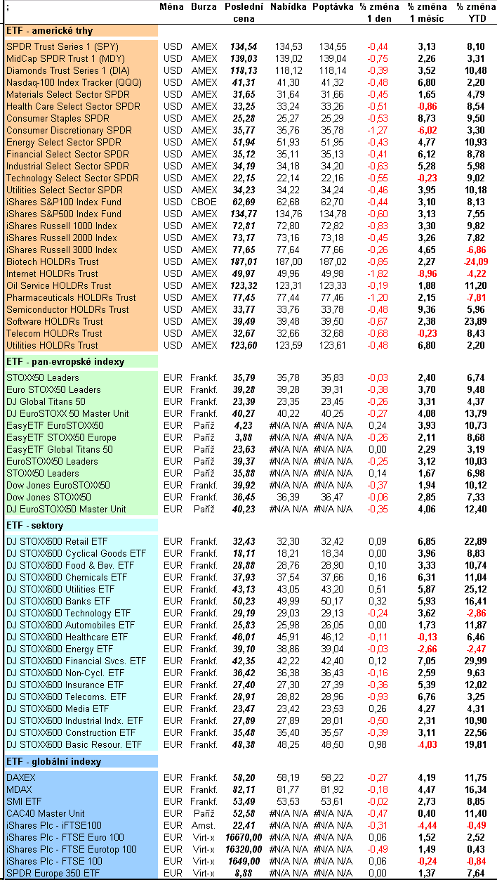 Patria přináší svým klientům přehled odpoledního vývoje tzv. Exchange Traded Funds (ETF). ETF jsou indexové podílové fondy, jejichž podkladovým aktivem je již existující index, které se obchodují jako akcie a umožňují tak investorům nakupovat nebo prodávat celé indexy ve formě jednoho konkrétního cenného papíru. Cena ETF se tvoří pohybem hodnoty jednotlivých indexů a nemůže tak dojít k odchylce mezi výkonností a výnosem daného indexu a jím sledovaného ETF. ETF jsou proto vyhledávaným produktem, který nahrazuje mnohdy nákladnější investování přes podílové fondy, jejichž tzv. „benchmarkem“ je vývoj daného burzovního indexu. V tabulce uvedené ceny jsou platné k okamžiku zveřejnění komentáře.